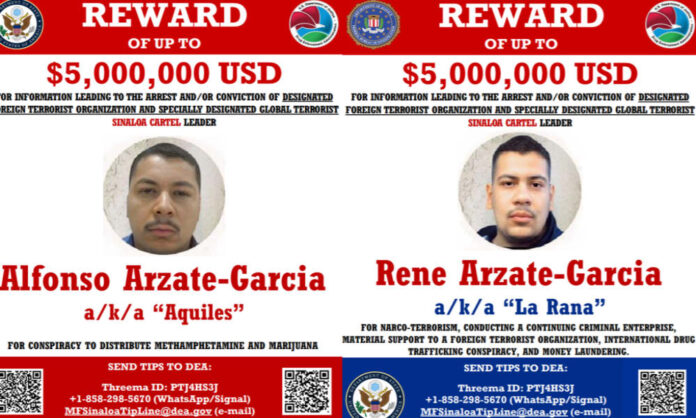 The State Department said it will pay up to $5 million each for René Arzate-García, known as “La Rana,” and his brother Alfonso Arzate-García, known as “Aquiles.” Authorities allege the pair have controlled the so-called “Tijuana Plaza” — one of the most significant drug corridors into Southern California — for more than a decade.