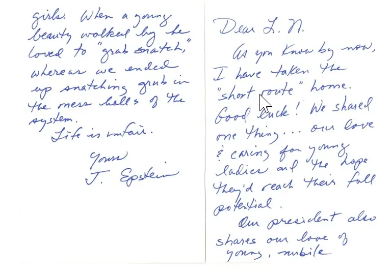 The fabricated letter attempted to create false equivalence between the two men’s crimes, stating: “We shared one thing … our love & caring for young ladies and the hope they’d reach their full potential.”