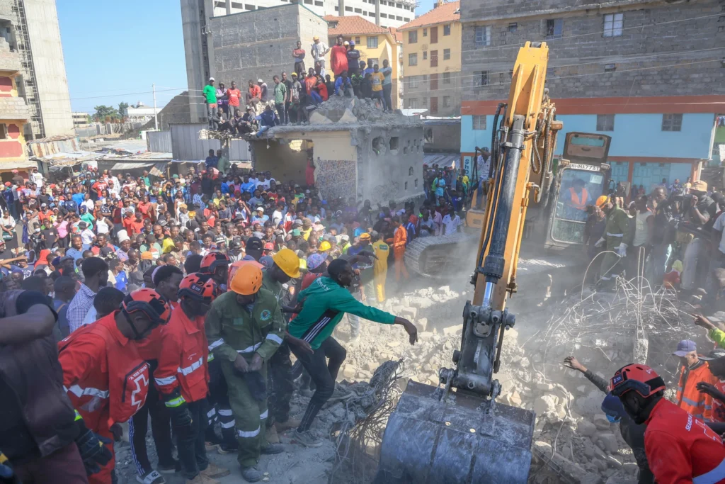 Emergency crews, including soldiers from the Kenya Defence Forces, joined first responders and local authorities in the rescue effort as heavy debris covered the area.