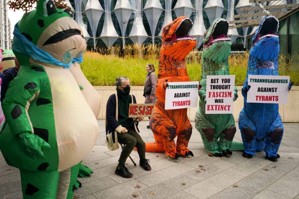 Protester Aliston Elliot, wearing a Statue of Liberty headpiece and holding a “No Wannabe Dictators” sign, said: “We want to show our support for democracy and for fighting for what is right. I’m against the overreach of power.”