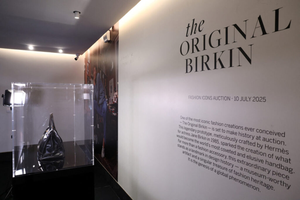 The Original Birkin, the handbag crafted by French luxury fashion house Hermes for artist Jane Birkin and offered to her in 1985, is displayed during a media preview of Sotheby’s Paris Fashion Icons Sale at Sotheby’s auction house in Paris, France, July 2, 2025. REUTERS/Tom Nicholson