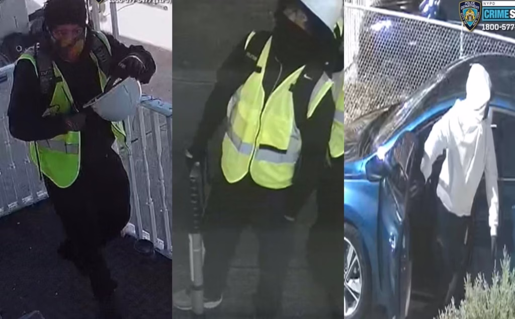 Surveillance footage captured the suspects fleeing east on 84th Drive in a blue Hyundai Elantra. Police described one suspect as wearing a black sweatshirt, black pants, black sneakers, a neon construction vest, a white construction hat, eye protection, and carrying a black backpack.